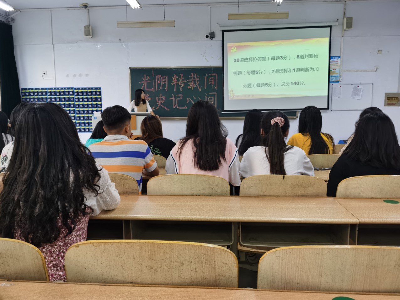 在重温红色记忆板块中,同学们一起观看了红色影片—《我和我的祖国》,回忆了那一段段光荣而难忘的历史时刻,激发了他们的爱党爱国热情;举办“光阴转载间,党史记心间”党史快问快答知识竞赛活动,同学们纷纷举手,迅速站起自信地说出心中的答案,在一步步地思考与探索中深切感悟党的奋斗历史。