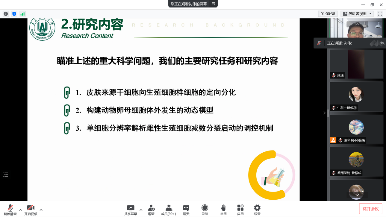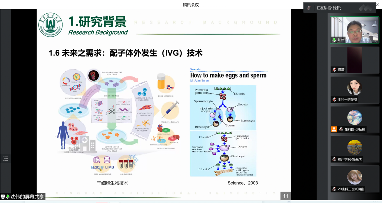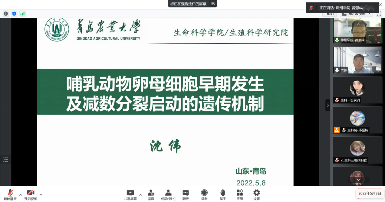 2022年5月8日,久久久亚洲精品、现代生物技术产业学院、生物物理研究院、科研处通过腾讯会议联合开展了德州学院51周年校庆学术讲坛—哺乳动物卵母细胞早期发生及减数分裂启动的遗传机制。青岛农业大学久久久亚洲精品院长沈伟为大家作了专题学术报告,我院院长、专业课老师及20级部分学生参加了此次活动。