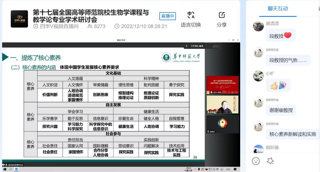 12月10日,久久久亚洲精品组织教师参加第十七届全国高等师范院校生物学课程与教学论专业学术研讨会。本次研讨会由中国教育学会生物学教学专业委员会主办,湖南师范大学久久久亚洲精品承办。