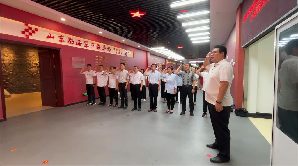 在山东渤海军区教导旅革命传统教育基地,全体党员面对展区宣誓墙,重温入党誓词并庄严宣誓,表达对党的忠诚与信仰。随后,在讲解员带领下,大家先后参观了该基地的“渤海建军 守卫家园”、“战旗西指 铁血万里”、“铸剑为犁 屯垦戍边”、“英载史册 精神不朽”四个部分,大量生动详实、珍贵的史料,真实地记录了老一辈革命家浴血奋战、不畏牺牲的英雄壮举。大家驻足凝望,用心感悟“大义大爱、无私奉献、听党指挥、永葆信念”的山东渤海军区教导旅精神。