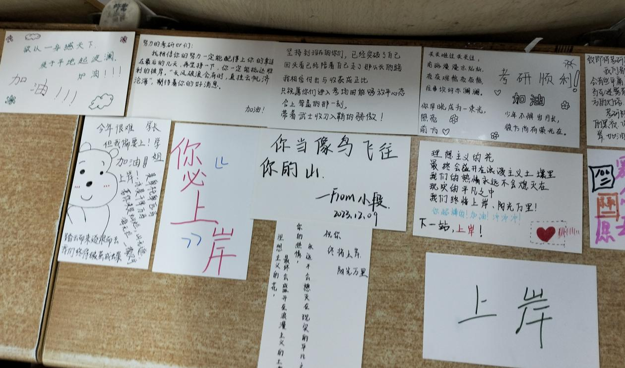 23级同学们以极大的热情投入到活动中,精致的贺卡装饰代表着大家热忱的希望,“守得云开见月明,祝学长学姐一战成硕,成功上岸!”“我们都有光明的未来。”同学们用笔写下暖心的文字,为辛苦备战的考研人加油鼓劲。在活动当天,同学们将贺卡放置在备考学生桌子上,收到贺卡后,考研学子露出了开心的笑容,紧绷已久的心理压力得到了释放。
