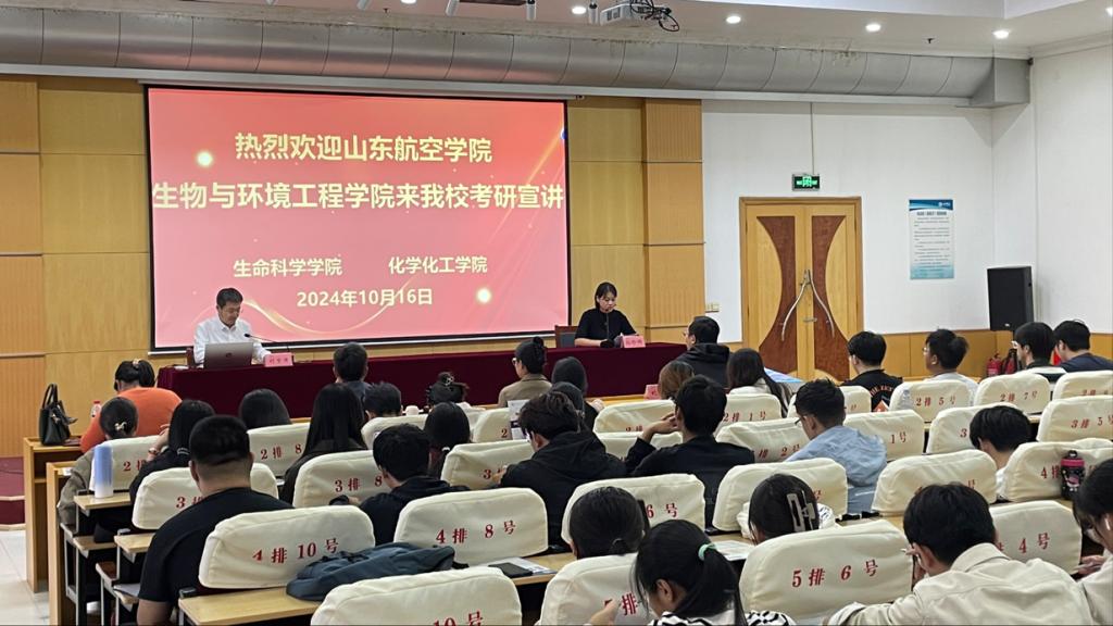 10月16日,山东航空学院生物与环境工程学院副院长刘京涛教授、刘龙祥副教授莅临我校进行硕士研究生招生宣讲,久久久亚洲精品团委书记孙珍辉主持。