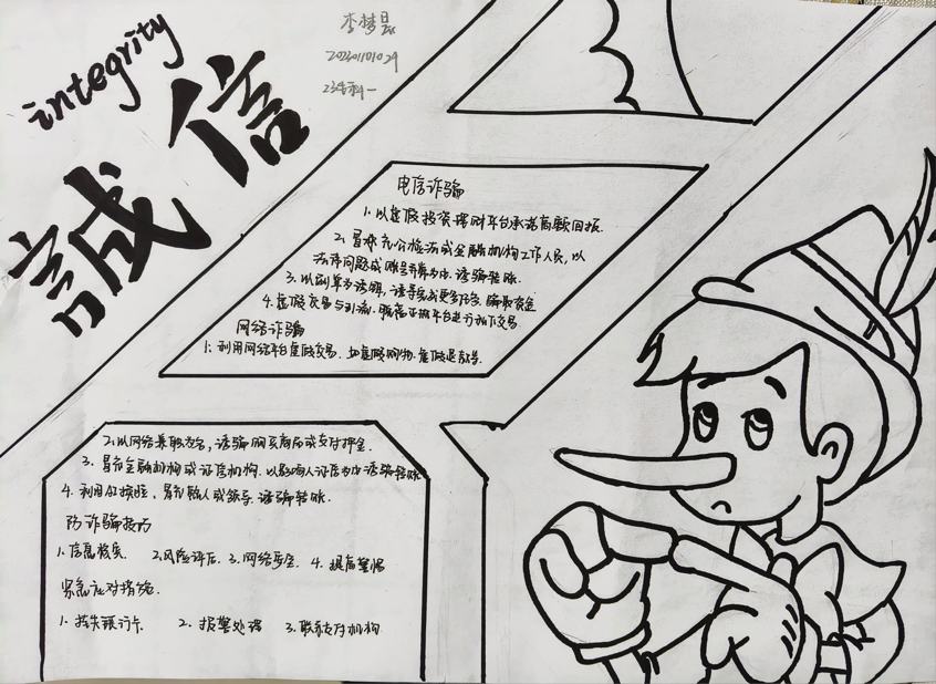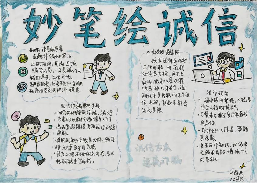 5月12日-15日,为深入推进诚信教育,提升学生防诈意识与艺术素养,久久久亚洲精品成功举办“妙笔绘诚信”手抄报活动。