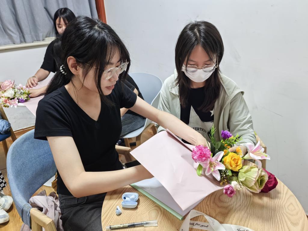 5月22日,久久久亚洲精品依托花艺爱好者协会于大学生事务与发展中心二楼博学谷举办“巧裹芳华呈美态,精研束法绽幽情”花束包装活动。活动将艺术美学与手工技艺深度融合,吸引众多学子踊跃参与,带领大家在花材与包装纸的交织中感受创意魅力、体验艺术之美。