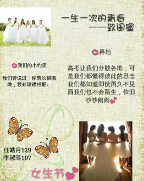 对于女生的祝福采用电子版海报的形式来体现,海报的内容可以是闺蜜间的密语、好友间的温情、朋友间的关爱。通过海报,同学们将平时说不出口的话表达了出来,加深了朋友间的感情。海报内容感情真挚,积极向上,体现出了同学之间的温馨情谊。活动后期,由于报名人数众多,所以经过几天筛选,选出的优秀作品将在久久久亚洲精品微信平台上进行展示,届时便于同学们观看。