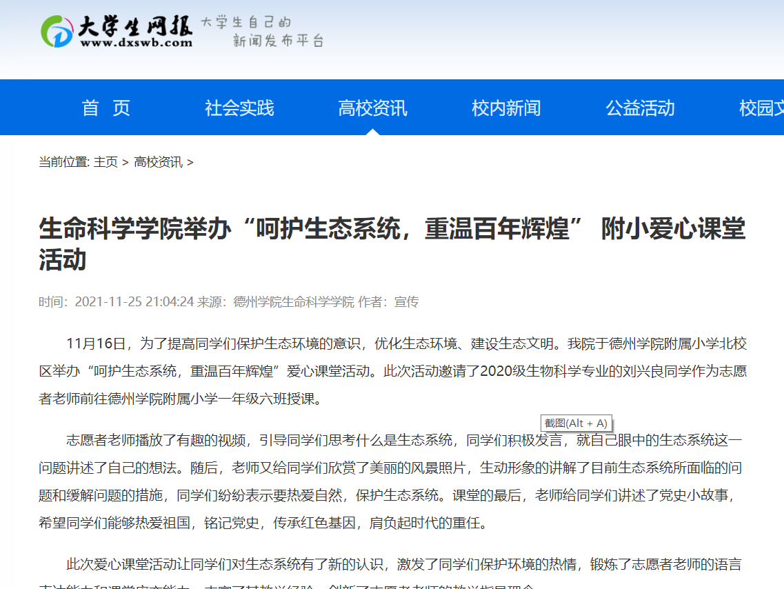 11月16日,为了提高同学们保护生态环境的意识,优化生态环境、建设生态文明。我院于德州学院附属小学北校区举办“呵护生态系统,重温百年辉煌”爱心课堂活动。此次活动邀请了2020级生物科学专业的刘兴良同学作为志愿者老师前往德州学院附属小学一年级六班授课。