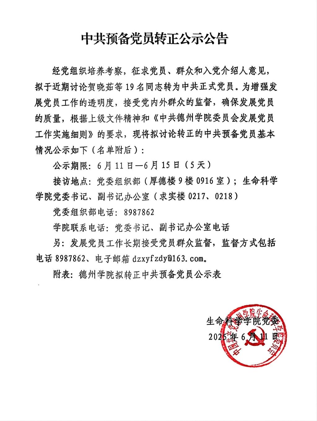 德州学院拟接收预备党员公示公告