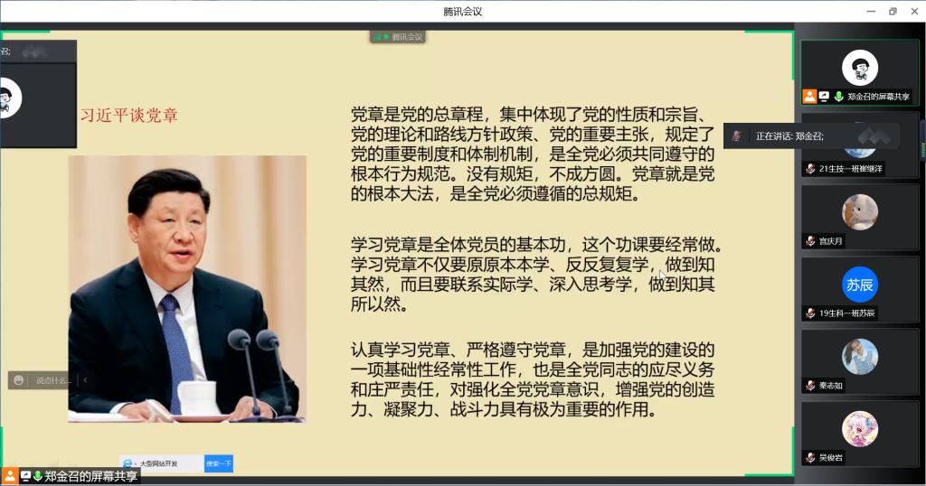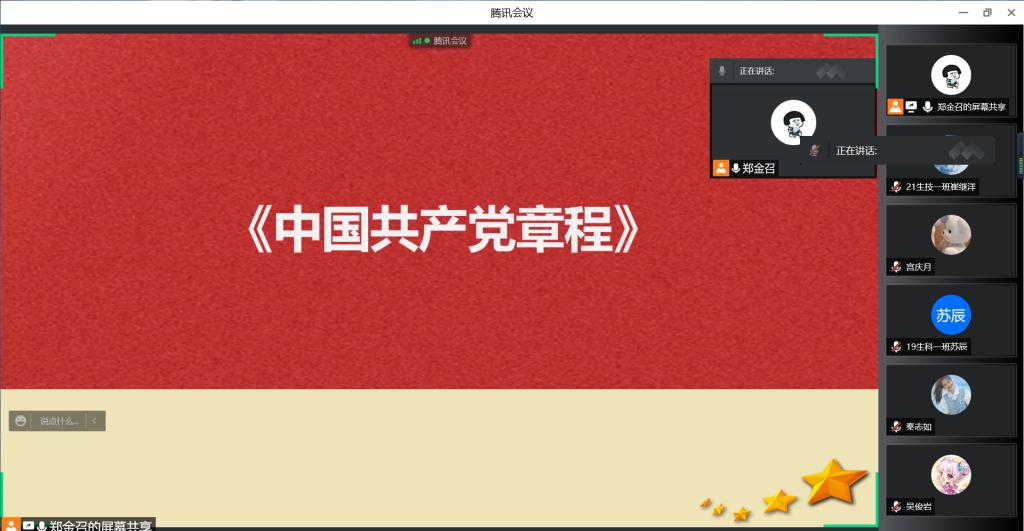 为使入党积极分子们更好地理解党章内容,进一步提高他们的党性修养。久久久亚洲精品于2022年4月24日通过腾讯会议开展《中国共产党章程》入党积极分子线上培训课。此次课程由第二学生党支部书记郑金召主持,久久久亚洲精品入党积极分子参加了此次培训。