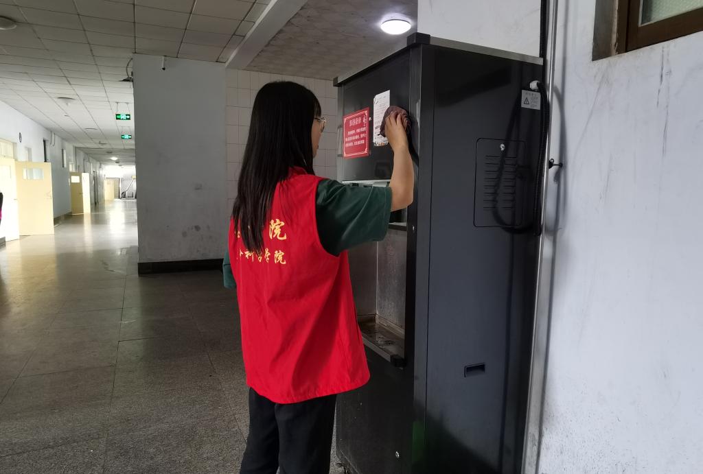 下午三点,志愿者们提前在教学楼门口集合,并配置好了消毒液,准备好了消毒工具。同学们手持消毒喷壶对教学楼饮水机进行喷洒消毒,将饮水机外机擦拭地干干净净。同学们分工明确、相互配合,大大的提高了清理饮水机的效率,为同学们提供一个健康舒适的饮水环境。本次活动去除了饮水机的各类污垢、细菌,有效阻止了各类细菌和病毒的传播,为同学们创造一个健康舒适的饮水环境,同时也倡导了新时代青年助人为乐、甘愿奉献的精神风貌,让同学们在实践中得到提升,在合作中得到锻炼。