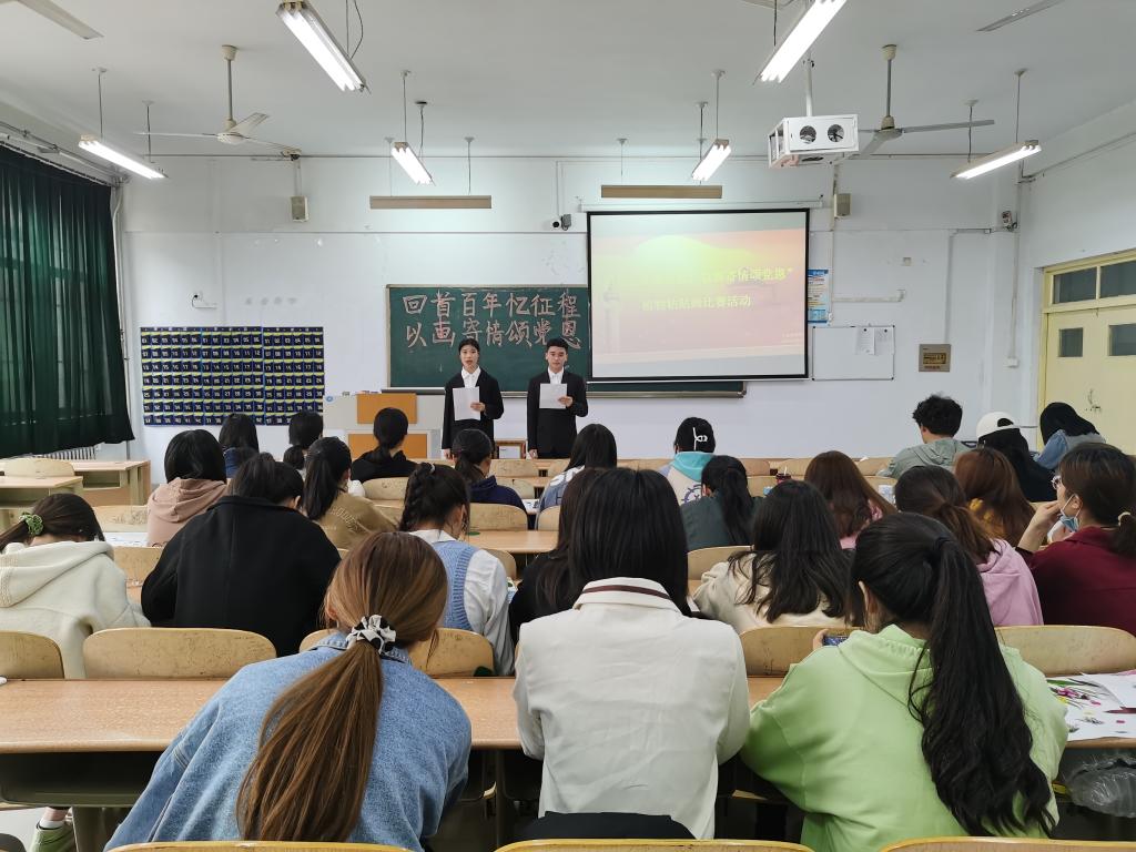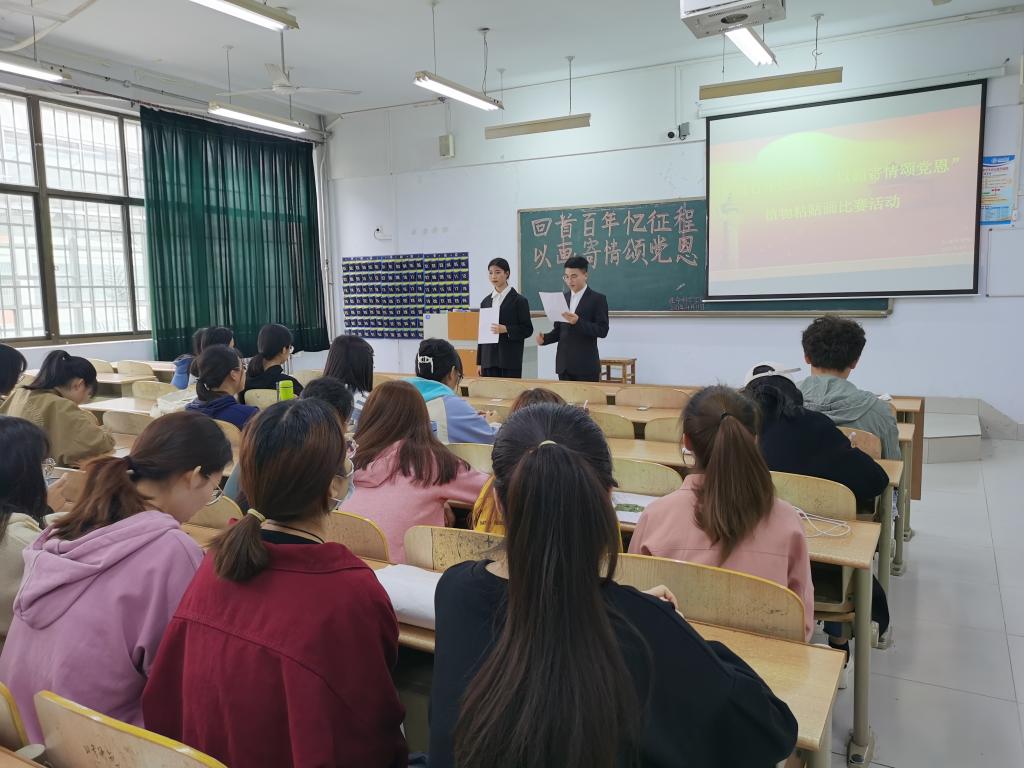 活动开始之前,参赛人员陆续进场,按照小组形式有序坐好,并进行签到工作。活动负责人员写好黑板字,布置好海报,一切活动准备就绪。随着主持人精彩的致辞,同学们期待已久的粘贴画活动拉开了序幕。活动过程中,他们拿出精心制作的粘贴画,并由每个组的代表上台讲解自己的作品。其中第六组同学的作品《百年伟业》尤为惊艳,该作品向大家展现了一个闪闪发光的党徽,它象征着中国共产党是一个安抚人心的神圣光芒,同时也流露出同学们对英雄人物的真诚的敬意。本次活动作品生动形象地展示了当代大学生们对中国共产党的感恩之情与崇高敬意,每一幅作品都蕴含着独特的意义,唯一不变的是同学们对党深深的热爱。比赛结束后,同学们纷纷表示此次活动丰富了大学生的课外生活,提高了他们学习党史的积极性。