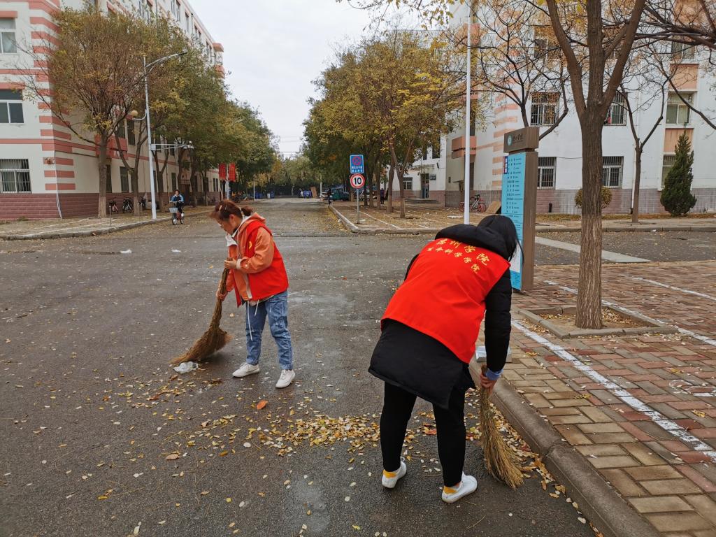 昨晚的一场雨让落叶粘在地面上很难清理,上午,志愿者们带好清扫的工具准备清扫落叶。虽然温度很低,但这没有削减志愿者们清扫校园的热情。志愿者们分工合理,两人或三人一组,划分不同区域进行打扫。有的志愿者用扫帚将落叶收集成一堆,有的将落叶装进垃圾桶,相互配合。没过多久地上的落叶就都打扫干净了,地面焕然一新。严冬似乎也因为他们的劳动而不再寒冷。在这个冬天里,他们认真清扫的身影是德院一道靓丽的风景。